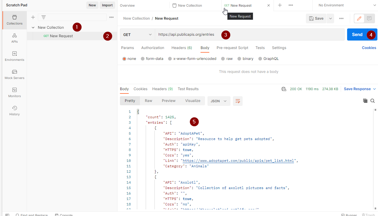 Ahogy a képen látható, először létre kell hozni egy Collection-t, amibe majd létrehozzuk az első request-et, majd pedig kitöltjük a request tulajdonságait. Ahogy látható, meg kell határoznunk a request típusat, ami itt egy GET, de lehet igen sokféle. Erről bővebben itt olvashatsz. A teljesség igénye nélkül, itt van pár, amit mi használunk (GET, POST, PATCH, PUT, DELETE). Visszatérve a példához, miután kiválasztottuk a típusát, meg kell adnunk a végpontot (3), majd pedig a SEND gomb megnyomásával (4) elküldjük, és egy pillanat múlva érkezik is rá a válasz (5) json formátumban. Ezek voltak az alapok, és ezzel igazából sok esetben, mint manuális tesztelők képesek vagyunk ellátni az alapvető feladatainkat, de kérlek, ne eléged meg ennyivel, és olvass tovább!