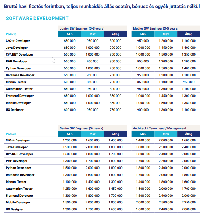 Nézzük is meg közelebbről azt, ami engem érdekel. Megnyitva és kicsit lefelé görgetve jól látható, hogy szektorokra van bontva, azon belül pedig szintekre, pozíciókra, hogy mennyi bruttó fizetés jött ki az általuk készített felmérés alapján. Én gyorsan a Software Development részhez görgetek, ahol is rögtön szembe is jön velem az, hogy a tesztelés ez alá a kategória alá került. Személy szerint én azért ennek is adnék egy külön kategóriát, bár biztos, hogy van ebben a felépítésben ráció, ahogy ők gondoltál.